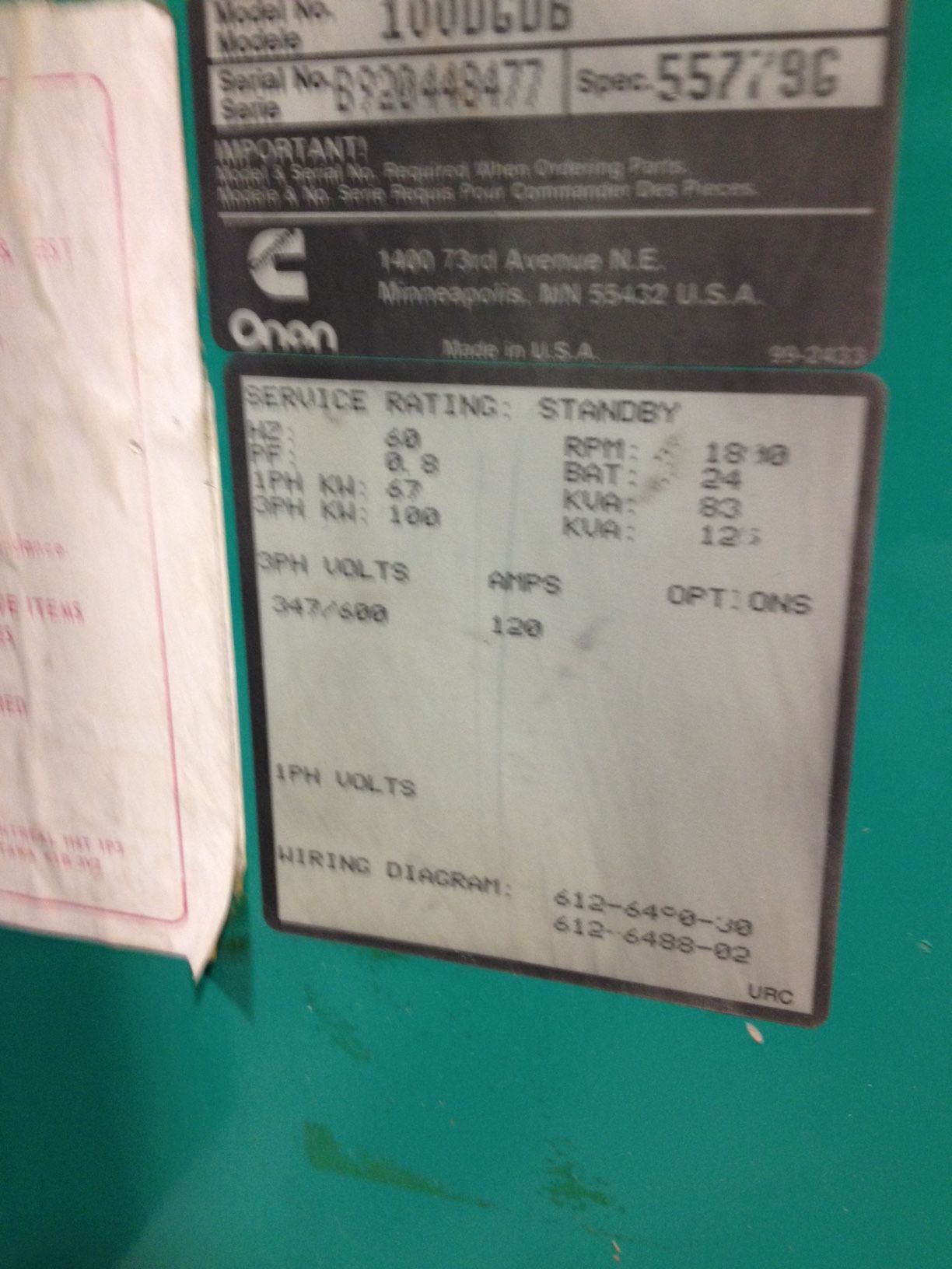 Cummins/Onan 125 KVA/100KW