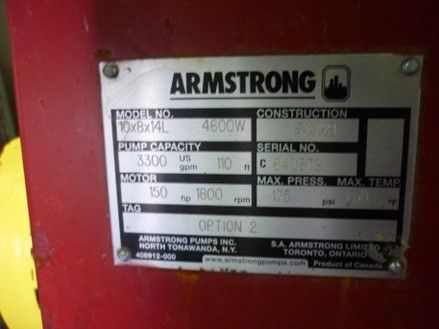 Pompe Seul de surpression ARMSTRONG Capacity: 3300 gpm a 110 ft Moteur 150 hp , 1800 rpm non inclus